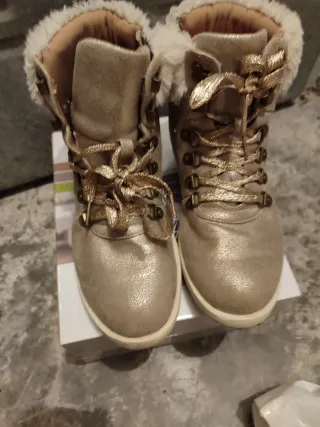 Botas de niña con un acabado metalizado en tono dorado y detalles de pelo sintético en el cuello. - Cierre con cordones dorados. - Forro interior suave. - Suela de goma.