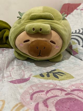 Adorable peluche de capibara con un divertido disfraz de cocodrilo. - Diseño tierno y suave. - Color verde. - Ideal para coleccionar o regalar.