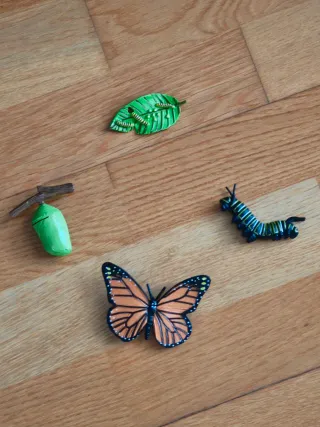 Este juego educativo muestra las etapas del ciclo de vida de una mariposa. - Incluye una hoja con orugas. - Una crisálida colgando de una rama. - Una oruga. - Una mariposa.