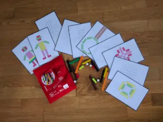 Juego de construcción Goula con bolsa de tela roja. - Incluye 55 piezas de regletas de colores. - Contiene 10 tarjetas con diseños para crear y practicar con las cantidades.