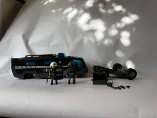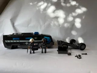 Set de Playmobil de la policía con un camión blindado y dos figuras. - Camión policial negro con detalles azules. - Dos figuras de policías con equipo táctico. - Incluye accesorios como escudos y armas.