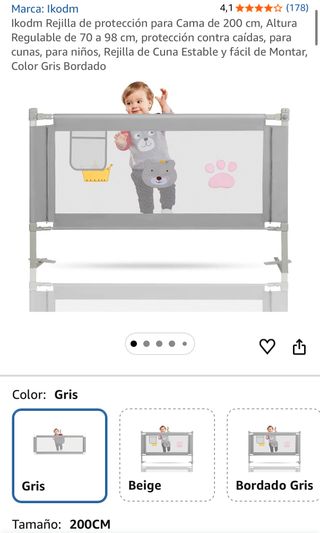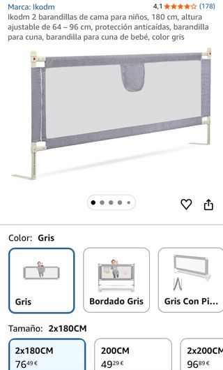 Se venden dos barandillas para cama de 180 cm y una de 200 cm. Son ideales para la seguridad de los niños. Están nuevas, pero las vendemos porque no valen para canapé, sobretodo tiene que ser cama con listones de madera para que funcione. Se venden también por separado. No hacen envíos porque el producto es muy pesado y el envío es muy caro, por eso no lo devolvimos. - Color gris. - Altura ajustable de 64-96 cm. - Protección anticaídas.