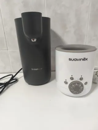 Práctico conjunto de calienta biberones y dispensador de agua caliente. Ideal para preparar las tomas del bebé de forma rápida y segura. - Calienta biberones de color blanco con marca Suavinex. - Dispensador de agua caliente de color gris oscuro con marca Babymoov.
