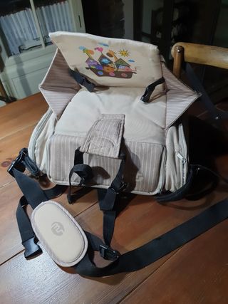 Bolsa de viaje o neceser que tiene función alzador y con dos bolsillos térmicos para llevar biberón caliente o agua fresca. Ligera