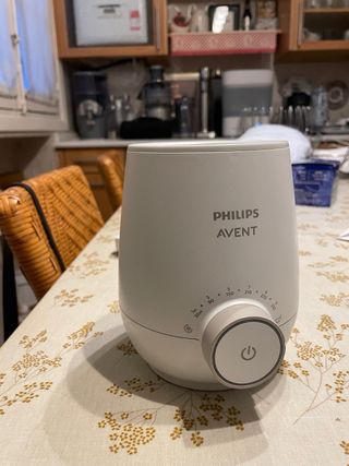 Calienta biberones de la marca Philips Avent. La abertura es lo suficientemente amplia para todo tipo de biberones. Se apaga solo cuando alcanza la temperatura indicada. Para mí fue muy útil porque también porque me regulaba bien con la temperatura, pero ahora por motivos de mudanza no podemos llevarlo con nosotros. - Diseño compacto y fácil de usar con el cable que se puede acortar o conservar por completo enrollándolo debajo de la base. - Indicador luminoso de funcionamiento.