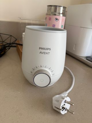Calienta biberones de la marca Philips Avent. La abertura es lo suficientemente amplia para todo tipo de biberones. Se apaga solo cuando alcanza la temperatura indicada. Para mí fue muy útil porque también porque me regulaba bien con la temperatura, pero ahora por motivos de mudanza no podemos llevarlo con nosotros. - Diseño compacto y fácil de usar con el cable que se puede acortar o conservar por completo enrollándolo debajo de la base. - Indicador luminoso de funcionamiento.