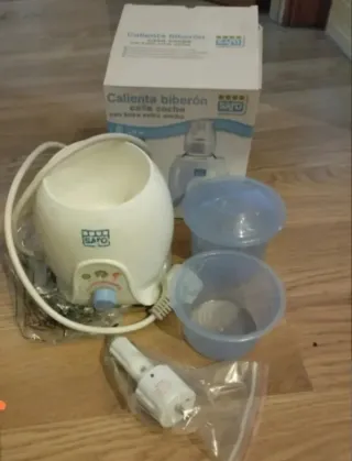 Calienta biberones digital de la marca Saro, ideal para usar tanto en casa como en el coche (con adaptador universal para el encendedor del coche). - Para tener la comida del bebé a punto de una manera rápida y sencilla. - Con boca ancha y recipiente para calentar potitos. - Diseño moderno y compacto. - Pantalla digital. - Incluye accesorio para esterilizar. - Función ultra rápida. - Literalmente usado 1 día, así que está nuevo.