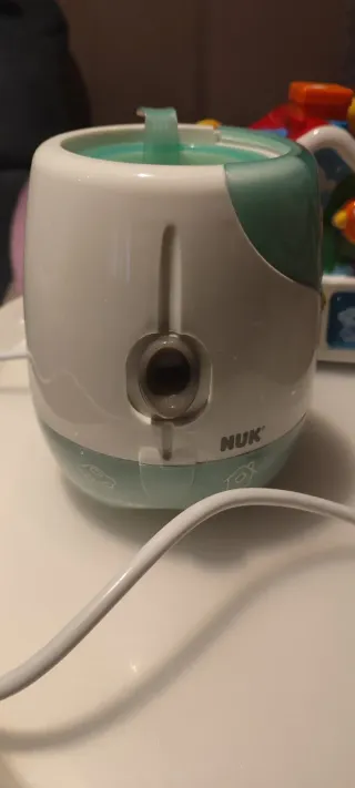 Calienta biberones de la marca NUK, en color blanco y verde menta. - Diseño compacto. - Indicador de nivel de agua.