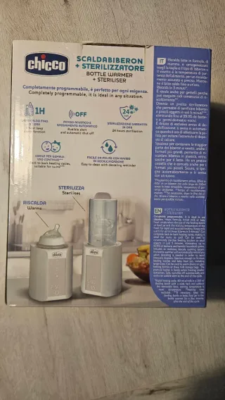 Práctico esterilizador y calienta biberones de la marca Chicco. Elimina hasta el 99,9% de los gérmenes domésticos. - Calienta en 3 minutos. - Esteriliza en 5 minutos. - Conserva los nutrientes de la leche materna. - Rápido y fácil de usar. Esta completamente nuevo, nunca usado.