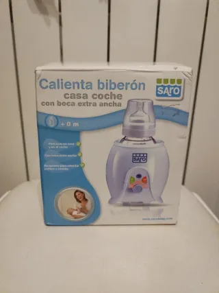 Calienta biberones Saro para casa y coche. Incluye adaptador para ponerlo en la toma de 12v de un vehículo y recipiente para calentar potitos. Nunca se ha usado.