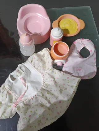 Conjunto de accesorios para muñeca de la marca Corolle. Incluye varios elementos para el cuidado y juego. - Biberón.2 - Plato con comida. - Orinal. - Babero. - Ropita. -calienta biberon