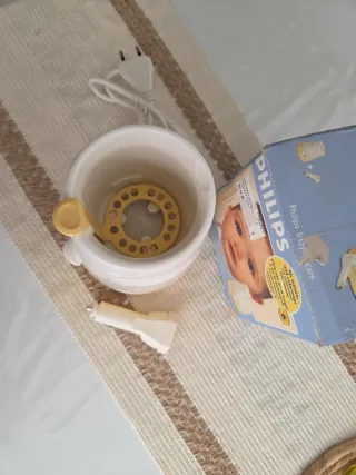 Como nuevo, usado muy pocas veces. lleva una toma de corriente para enchufe normal a 220 y otra para enchufe de mechero a 12v para el coche. Tiene modos de funcionamiento para leche materna y de fórmula, potitos, descongelación...Calienta la leche de forma gradual, ideal para que la leche materna conserve sus propiedades. También permite mantener el calor durante 1 hora.
