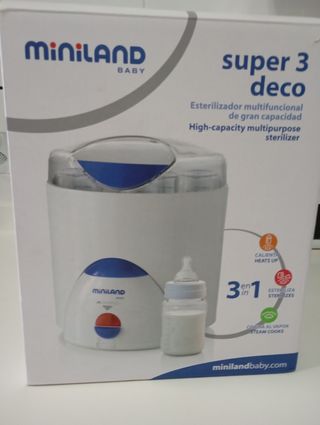 Calienta biberones/potitos y estirizador Con enchufe para casa y adaptador para usarlo en el coche( muy práctico) En muy buenas condiciones, se ha usado en muy pocas ocasiones. Marca Miniland En su caja con todos los utensilios y manual de instrucciones.