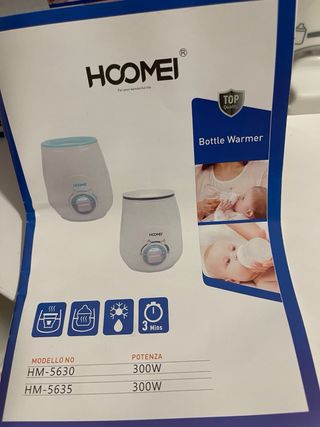 Calienta biberones eléctrico de la marca HOOMEI, modelo HM-5630. Ideal para calentar leche o comida para bebés de forma rápida y segura. - Potencia de 300W. - Diseño compacto y fácil de usar. - Incluye cable de alimentación.