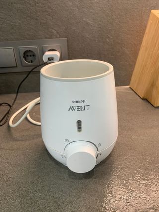 Calienta biberones de la marca Avent, modelo Express. Ideal para calentar leche o comida para bebés de forma rápida y segura. - Diseño compacto y fácil de usar. - Indicador de temperatura. - Incluye tapa.