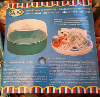 Esterilizador de microondas SARO para biberones y accesorios. Permite esterilizar hasta cuatro biberones a la vez. - Esterilización rápida y eficaz por vapor caliente. - No requiere productos adicionales. - Funciona en microondas familiares (500-850W). - Admite biberones y sus accesorios (tetinas, anillas, tapas). - Las botellas de los biberones se colocan boca abajo.