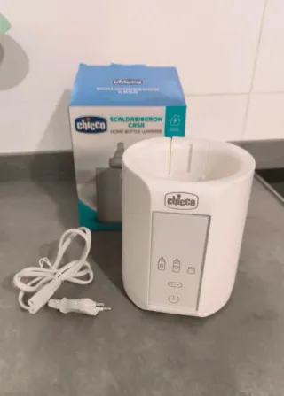 Calienta biberones y potitos Chicco en buen estado. Incluye el aparato y su soporte. Perfecto para calentar la comida del bebé de forma rápida y sencilla. - Marca: Chicco - Incluye soporte - Fácil de usar