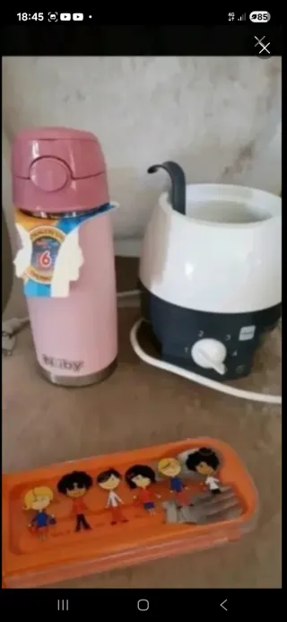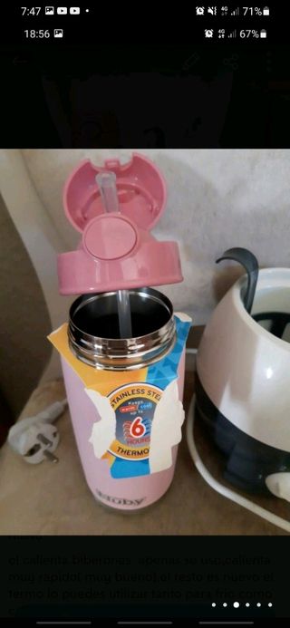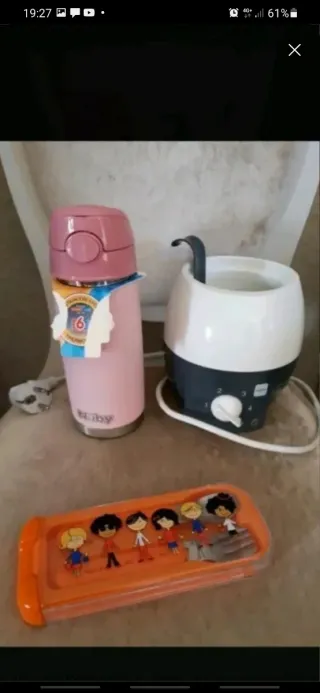 Vendo un práctico pack para bebé que incluye un termo rosa de la marca Nobi, un calienta biberones y un juego de cubiertos naranja con ilustraciones infantiles. El calienta biberones está nuevo. J - Calienta biberones eléctrico. -