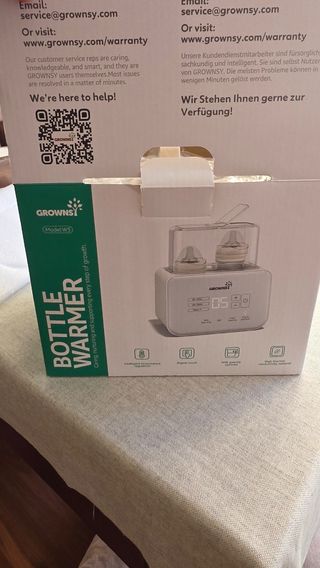 Calienta biberones de la marca Grownsy. Incluye un recipiente transparente. - Control giratorio con diferentes niveles de temperatura. - Indicador luminoso de funcionamiento. - Instrucciones de uso en alemán.