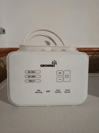 Calienta biberones de la marca Grownsy. Incluye el recipiente para el agua y la cesta. - Diseño blanco. - Compacto y fácil de usar. Muy intuitivo. - Nuevo pero sin caja, no nos hizo falta usarlo. -Calienta alimentos. - Vaporiza. - Baño maría. - Esterilizador. - Descongela.