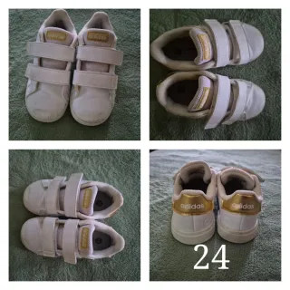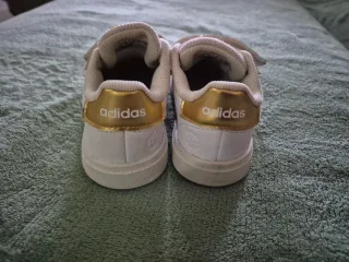 Zapatillas deportivas Adidas para niño en talla 24. Cierre de velcro para mayor comodidad. - Color blanco con detalles dorados. - Logo de Adidas en la lengüeta y el talón.