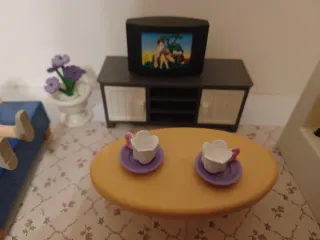 Creacion propia usando solo muebles y accesorios playmobil. Conjunto de Playmobil que representa un salón comedor con una familia. - Mesa con vajilla y copas. - Dos figuras de Playmobil. - Mueble de salón con televisión. - Dos figuras sentadas viendo la televisión.