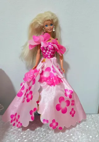 Muñeca Barbie original con un vestido espectacular lleno de flores, reversible (imágenes).