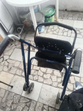 Andador de color azul, diseñado para facilitar la movilidad. - Asiento acolchado para descanso. - Ruedas delanteras para desplazamiento. - Empuñaduras ergonómicas. PRECIO A CONVENIR