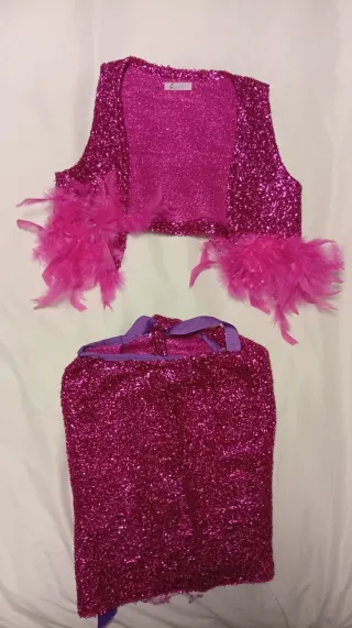 Disfraz infantil de brillitos y plumas, hecho a mano. - Talla 5-6 años. - Parte superior dorada brillante. - Falda y chaleco de brilli-brillis fucsia. - Detalle de plumas rosas y cinta morada.