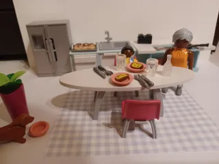 Set de cocina Playmobil con figuras y accesorios. - Cocina con electrodomésticos y armarios. - Mesa redonda con sillas. - Figuras de personas. - Accesorios variados para la cocina y la comida.