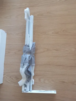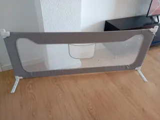 Barandilla de seguridad para cama infantil, ideal para prevenir caídas. - Estructura de tela gris. - Ventana de malla transparente. - Patas de soporte blancas. - Largo 1,77 mts - Alto 0,68 mts - Anchura Bajo Colchón 0,25 mts