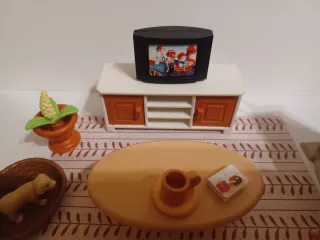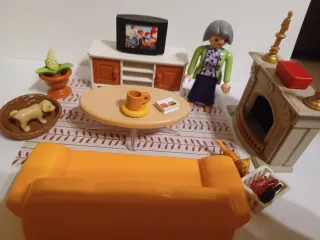 Creación propia usando solo muebles y accesorios playmobil. - Incluye figura de mujer mayor. - Sofá naranja. - Mesa de centro con taza y libro. - Chimenea con accesorios. - TV y mueble. - Maceta con planta. - Cama para perro con figura de perro. - figura de gato. - Cesta con lana.