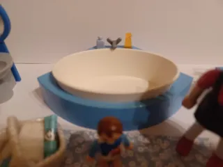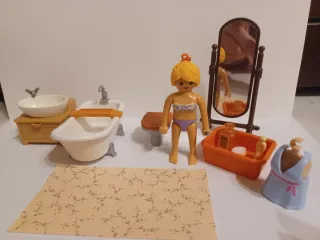 Set de baño Playmobil con figura. - Incluye bañera, lavabo, inodoro y espejo. - Figura de Playmobil con bikini y accesorios. - accesorios de baño.