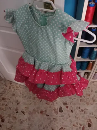 Bonito traje de flamenca para niña en color rojo. Tiene para sacarle mas talla - Diseño con volantes en mangas y falda. - Talla 6