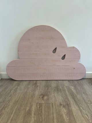 Cabecero infantil de madera, diseño en forma de nube, para colocar suspendido en la pared. Acabado en color rosa suave. 📏 Medidas: • Ancho: 108 cm • Alto: 73 cm 🛏️ Estado: nuevo, sin uso. Apto para camas infantiles o juveniles.