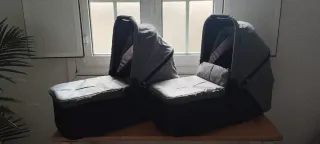 Se venden dos capazos completos para Niu Vent Twin, ideales para gemelos o hermanos con poca diferencia de edad. Incluyen capota y cubrepies. Color gris y negro. Tienen alguna marca de uso En caso de sólo necesitar un capazo, se vende por 40€ Con la compra de los dos, de regalo una capota extra.