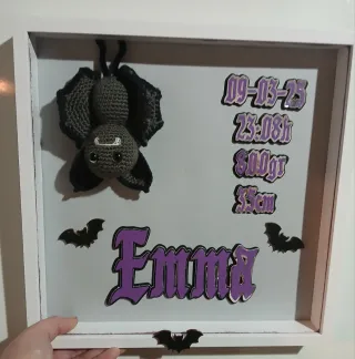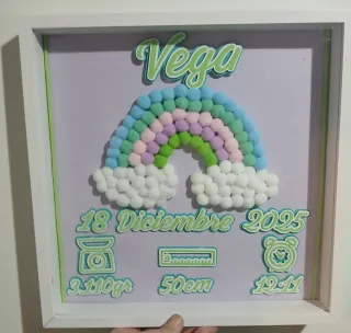 Marco de natalicio personalizado, ideal para regalar o decorar la habitación de un bebé. Incluye un dulce amigurumi de oveja y globos tejidos. - Nombre personalizado: Iria - Fecha de nacimiento: 29-03-25 - Hora de nacimiento: 18:35h - Peso: 2.785 kg - Altura: 48.5 cm
