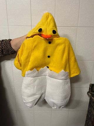 Disfraz de pollito o patito para bebé o infantil, ideal para carnaval o fiestas. - Diseño amarillo con capucha. - Detalles de ojos y pico. - Parte inferior blanca simulando un huevo.