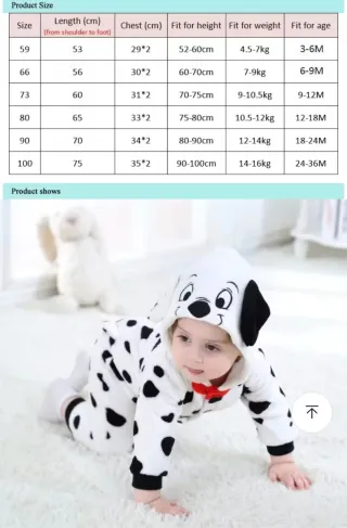 Disfraz de dálmata para bebé, perfecto para fiestas o para usar como pijama. COMPLETAMENTE NUEVO. SIN ESTRENAR. Me confundí en la talla. - Diseño de perro dálmata. - Capucha con cara de perro. - Cuello rojo. - Material suave y cómodo. Talla 66 (Tabla en la segunda foto)