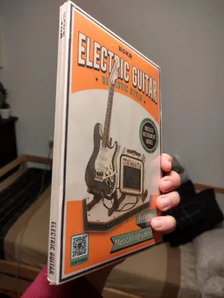 Kit de construcción de un modelo 3D de guitarra eléctrica de la marca ROKR. - Modelo: Guitarra Eléctrica. - Material: Madera. - Estilo: Realista. - Tipo: Instrumento musical. - Incluye instrucciones para el montaje.