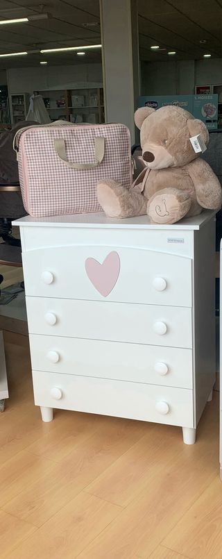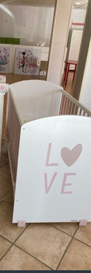 Conjunto de cuna y cómoda bañera con diseño Love de la marca Trama. Ideal para la habitación del bebé. - Cómoda con cambiador. - Cuna con laterales de barrotes. - Diseño moderno y tierno. Se venden por separado 200 c/u
