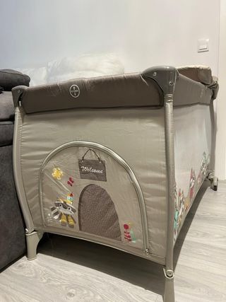 Cuna de viaje con funcion parque y cambiador incorporado. Cuenta en in lateral con una puerta para que el bebe entra y salga con independencia. Esta en perfecto estado. Es de color beige. En su interior tiene una base de madera acolchadita para darle firmeza. Esta base se puede poner tambien a media altura para usarlo de cuna. Cuenta con ruedas en un lateral para facilitar el transporte