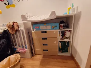 Mueble cambiador de bebé de la marca Ikea. Ideal para la habitación infantil. - Estructura blanca. - Cajones con tiradores turquesa. - Estanterías para libros y accesorios. Hay que desmontar. Entregamos con dos fundas para el cambiador. Se convierte en escritorio. Estamos en el Prat de Llobregat.
