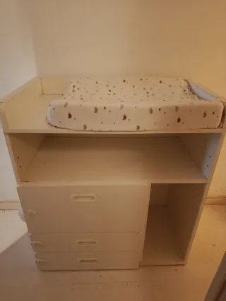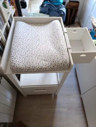 Mueble cambiador para bebé en madera blanca. Cuenta con dos cajones amplios y un espacio abierto superior para tener todo a mano. Lo vendo con cambiador de espuma y funda. Tiene poco uso, es de madera y no de Ikea. Se vende por mudanza y puede usarse como cómoda también. Pesa 20 kg Anchura 80 cm Altura 110 cm Profundidad 48 cm