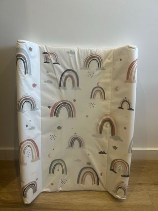 Cambiador para bebé con un bonito estampado de arcoíris y nubes. - Diseño alegre y colorido. - Material impermeable y fácil de limpiar. - Bordes elevados para mayor seguridad. Medidas: 70 cm x50 cm