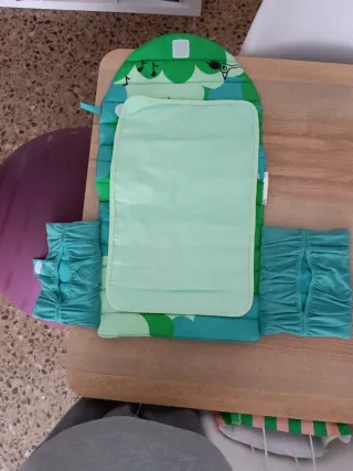 Práctico cambiador portátil para bebés, ideal para llevar en el bolso o mochila. Su diseño acolchado ofrece comodidad. - Color verde y turquesa. - Acolchado. - Cierre con botón a presión.