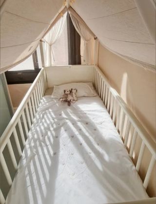Cama evolutiva marca STOKKE en forma de casita y cambiador a juego. La base del colchón puede ajustarse en altura para acostar y levantar fácilmente a tu bebe. Finalmente el lateral es desmontable para permitir el acceso del niño, como se aprecia en la foto. Adecuada desde el nacimiento hasta los 5 años aproximadamente. Se incluyen todos los accesorios, techo de la cuna, laterales, colchón, sábanas, protectores laterales del colchón y colchón del cambiador (se puede colocar sobre la cuna). Comprado en el Corte Inglés por 1.475€ más accesorios.