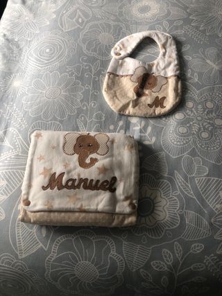Suele pasar que te encuentras con más cosas de las que necesitas. Fue un regalo y no se estrenó. 2 piezas: cambiador con nombre bordado y babero con inicial bordada. Es precioso, hecho a mano. Cada pieza 10 eur y las dos 18 eur.