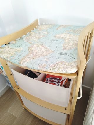 Se vende cambiador original de la marca Stokke, en muy buenas condiciones, y de muy buena calidad. Incluye todos los accesorios: 2 cestos para ropa y 2 bandejas organizadoras, además de una funda de tela impermeable mapamundi para su colchón cambiador. En la última foto se puede ver el único desperfecto que tiene en la parte trasera de una de las bandejas (que no afecta en nada a su funcionamiento). Lo vendo solamente porque vamos a tener a nuestro 3er bebé y necesitamos más almacenaje para la ropa. Preferiblemente venta en persona.