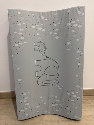 Cambiador para bebé de la marca Bebejou con un bonito diseño de elefantes y nubes. - Color gris. - Ideal para poner sobre una superficie dura como una cómoda. - Sus lados están elevados para evitar que el niño se caiga. -Dimensiones: 72 x 44 cm.